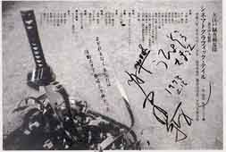 旗揚げ大騒動のとき大ファンのYapoosに招待状を出したら ボーカルの戸川純さんと仲原信雄さんが来てくれました。 そのときに戴いた戸川純さんのサインです。 出演のイカ山イカ夫さんと狂喜乱舞したっけ。一緒に写真 撮っておけばよかった。興奮して気が回らなかったんだ。 |