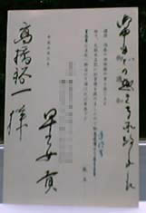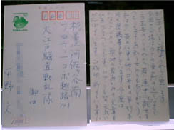 第弐回大騒動『戦国アルバイト』のとき、早乙女貢さんの『明智光秀』の 中の一文(光秀が信長を討つ、と家臣全員に宣言したとき)「一瞬声を 失い、次に、はげしいどよめきがおこった。戦国の武士たる者、主(あるじ) あるを知って主に主あるを知らず。かれらが主とこそ恃(たの)むは 惟任日向守(これとうひゅうがのかみ)光秀ただひとりである」に身震する程 感動して是非ナレーションで使わせて欲しい、と手紙を送ったら、恐れ多く も直筆のご返事を戴きました!今思い出しても涙が出る程かっこいい。 |